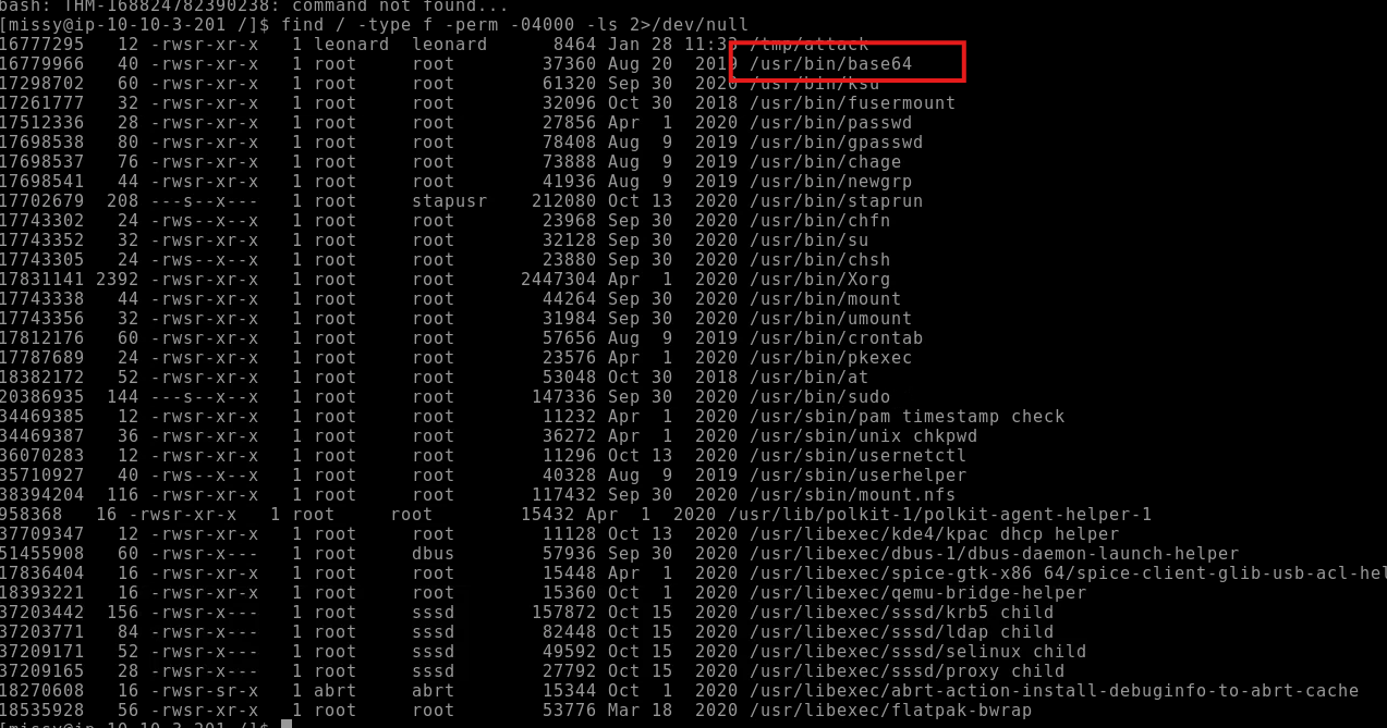 Figure 1: find reveals that /usr/bin/base64 has the SUID bit set.